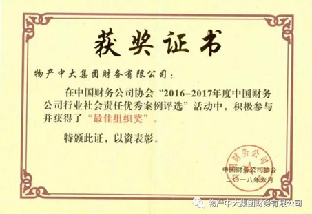 近期,中国财务公司协会授予物产中大集团财务有限公司“2016-2017年度中国财务公司行业社会责任优秀案例评选...