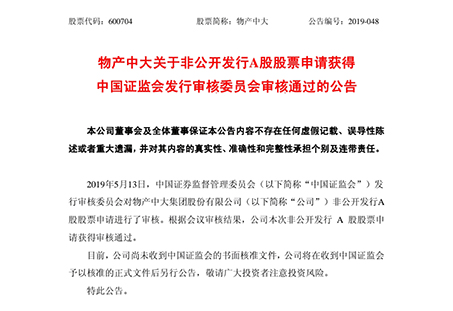 2019年5月14日,物产中大(600704.SH)发布公告,中国证监会发行审核委员会对公司非公开发行A股股票申请进...