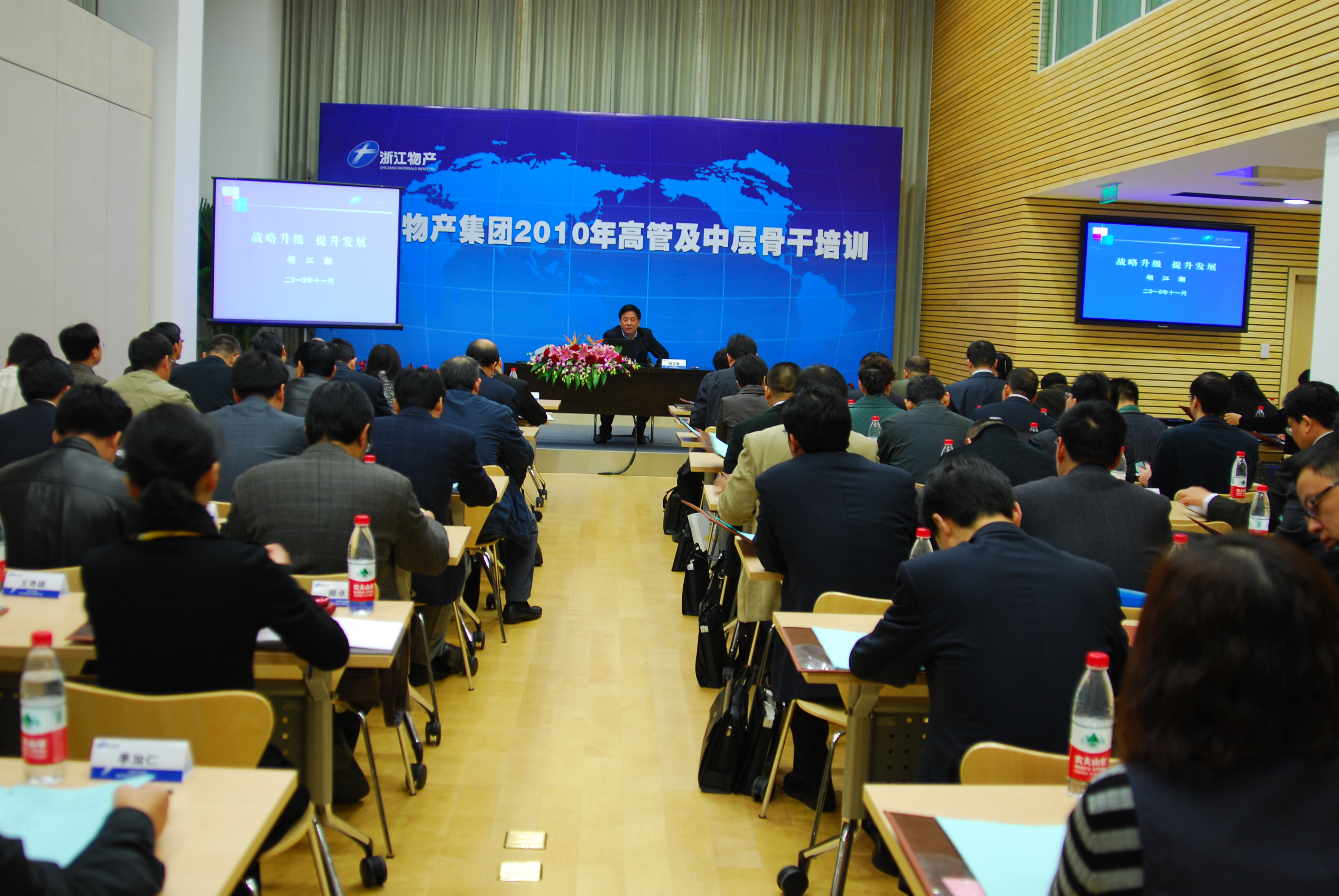 在浙江物产即将迈入世界500强之际,11月下旬至12月初,“集团2010年高管及中层骨干培训”先后分两期在浙江物产总部大楼举办。本次培训以集团“战略升级 提升发展”为主题,旨在提高学员在集团提升发展路径实施、学习型组织建设、商业模式创新、物流管理和资本市场运作等方面的知识和综合能力。来自集团公司及各控股成员企业的高管团队及中层骨干近200人分别参加了为期一周的集中培训。培训班上,集团公司董事长、党委书记胡江潮先后作了《战略升级 提升发展》和《知识型企业 学习型组织》的专题讲课。胡董事长从战略升级和提升发展两方面对集团战略升级的意义、执行基础、时代背景、产业变革、升级核心以及本质提升、业务提升、效率提升、商业模式创新提升、管理模式深化创新、执行力提升等进行了全面深入的阐述和讲解。他同时指出“物产集团将进入‘战略升级、提升发展’的新阶段。建立与企业转型后相一致的核心竞争力,或对原有核心竞争力进行切换,是企业持续发展,获得持续竞争优势的关键。最重要的是把企业打造成知识型企业、学习型组织,对企业进行知识管理,进行知识的积累与创新,从而形成自己的默会知识。