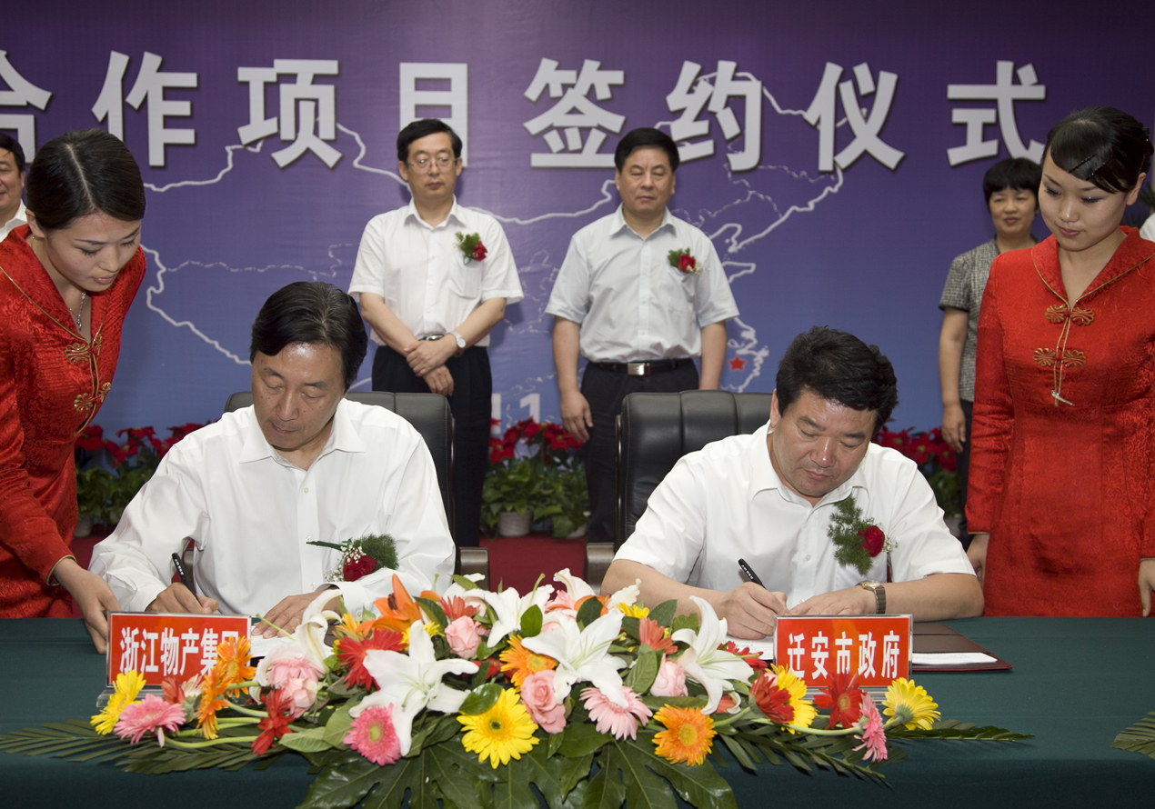 签约仪式上,集团公司隋剑光总经理与迁安市政府李忠市长分别代表合作双方签订了浙江物产北方钢铁物流基地项目合作协议。物产物流公司与唐山长城钢铁集团旗下九江线材、燕山钢铁、松汀钢铁、荣信钢铁、鑫达钢铁等5家钢厂签订了浙江物产北方供应链物流有限公司组建协议;物产金属与荣信钢铁、物产国际与鑫达钢铁也分别签订了合资合作协议。
