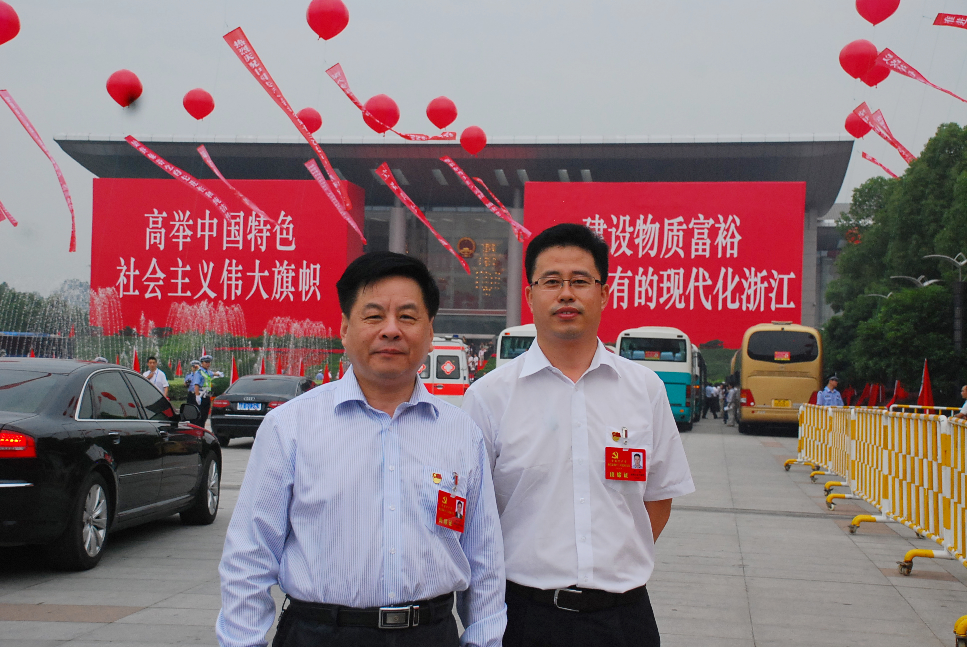 中国共产党浙江省第十三次党代会于6月6日在省人民大会堂隆重召开。我集团公司胡江潮董事长和浙江物产金属集团有限公司船舶供应链部负责人邓波同志作为省党代会代表出席这一盛会。图为胡董事长和邓波于大会开幕前在省人民大会堂前合影。 (摄影:黄文英)