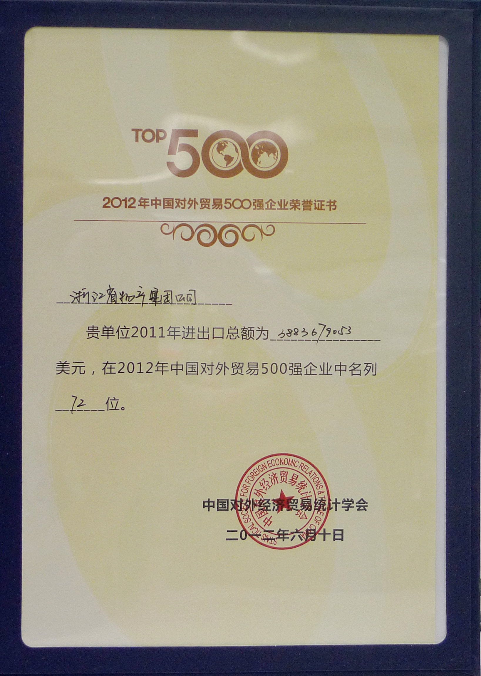 近日,由中国对外经济贸易统计学会发布了2012年中国对外贸易500强企业榜单,浙江省物产集团公司以2011年进出口总额3883679053美元列该榜单第72位。