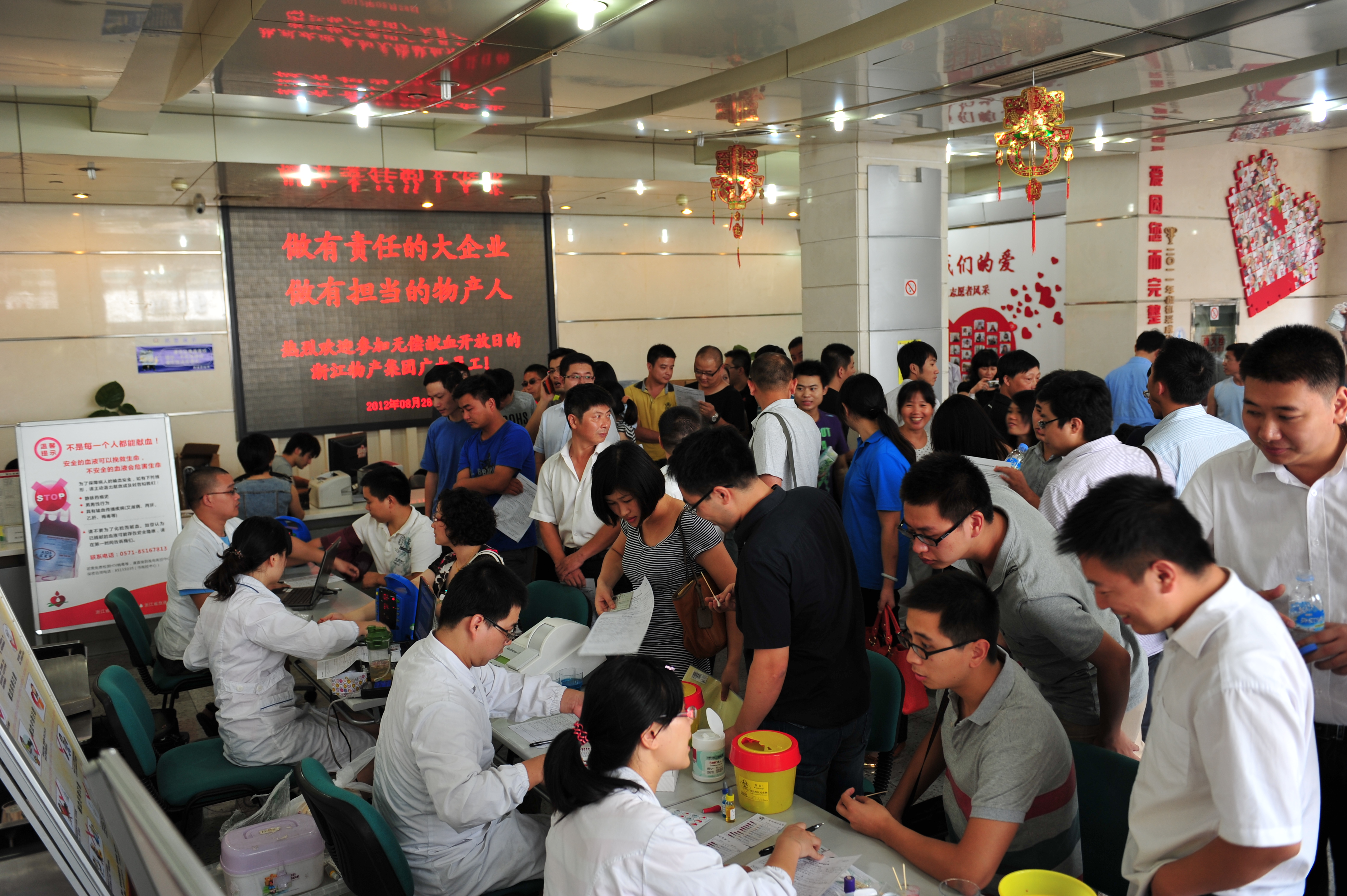 8月28日下午,位于杭州武林路上的浙江省血液中心献血大厅里人头攒动,热闹非凡。来自浙江物产集团总部及旗下各成员单位的200余名员工,正在这里参加由集团工会、团委联合发起组织的无偿献血活动。