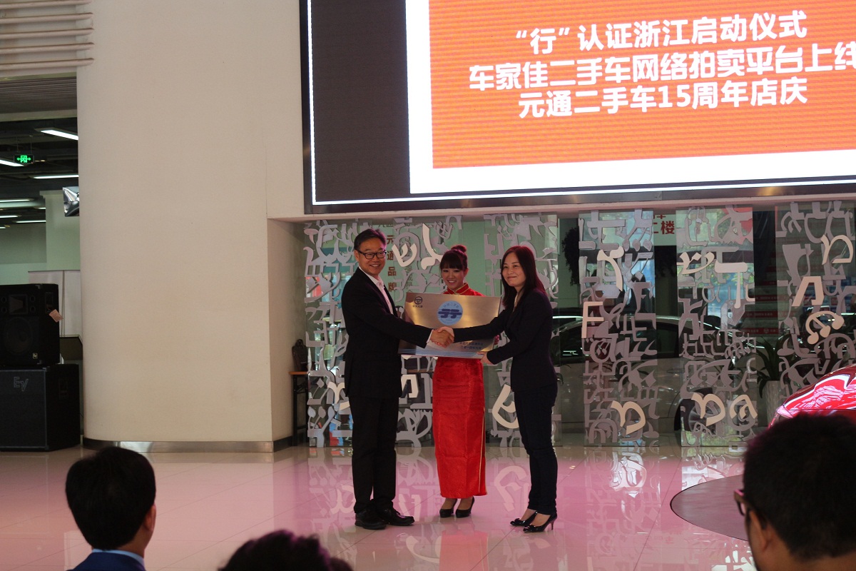近日,元通二手车“三喜临门”。10月25日,在元通汽车名品馆,元通二手车携10万车主迎来了15周年庆,并同步启动“行”认证、上线网拍平台,以实际行动感恩回馈社会、回馈客户。中国汽车流通协会副秘书长罗磊先生向物产中大元通汽车云服务公司总经理阮秀丽女士颁发了“行”认证机构授权牌,还同步诞生了浙江省第一台“行”认证二手车。