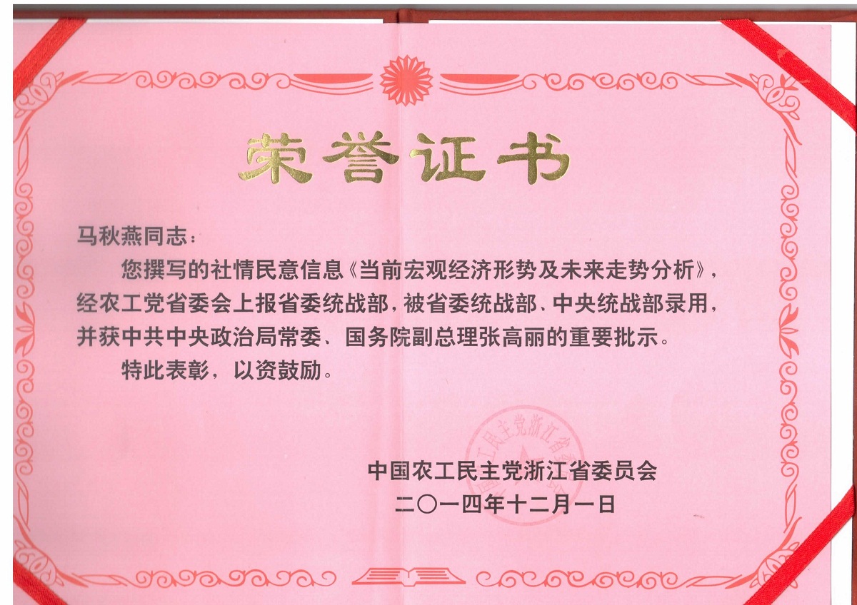 记者从中大期货公司获悉,该公司员工马秋燕今年6月撰写的社情民意信息《当前宏观经济形势与未来走势分析》建议书,经农工党浙江省委、浙江省委统战部上报中央统计部,被中央统战部录用,并获得中央政治局常委、国务院副总理张高丽的重要批示。近日,中大期货公司给予物质奖励,并专门发文,通报表彰马秋燕钻研业务、执着进取的精神,号召公司员工向她学习。