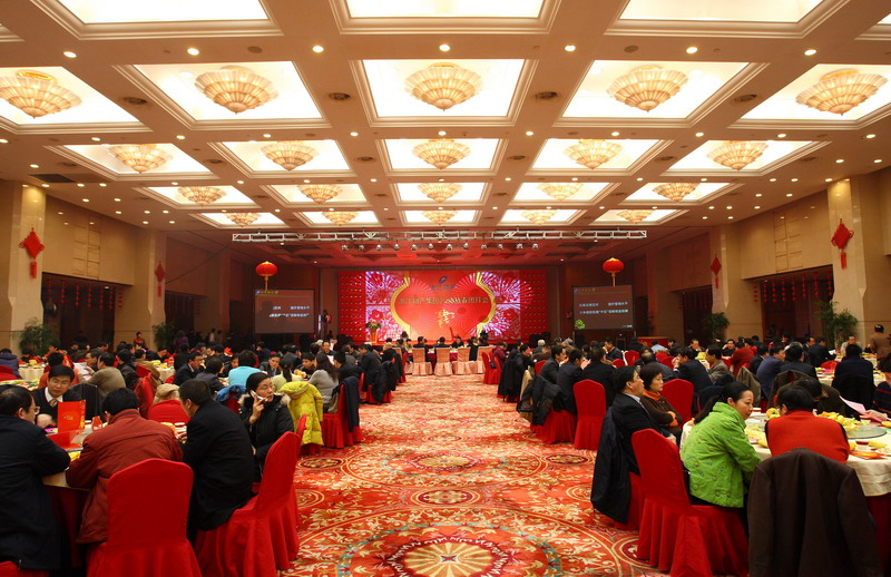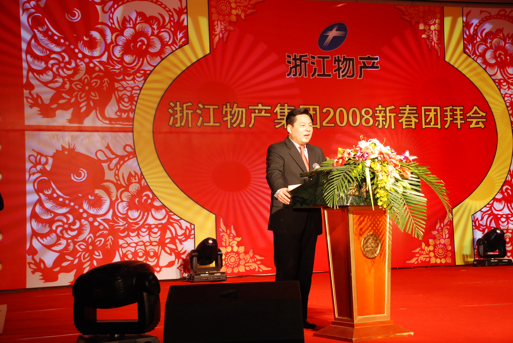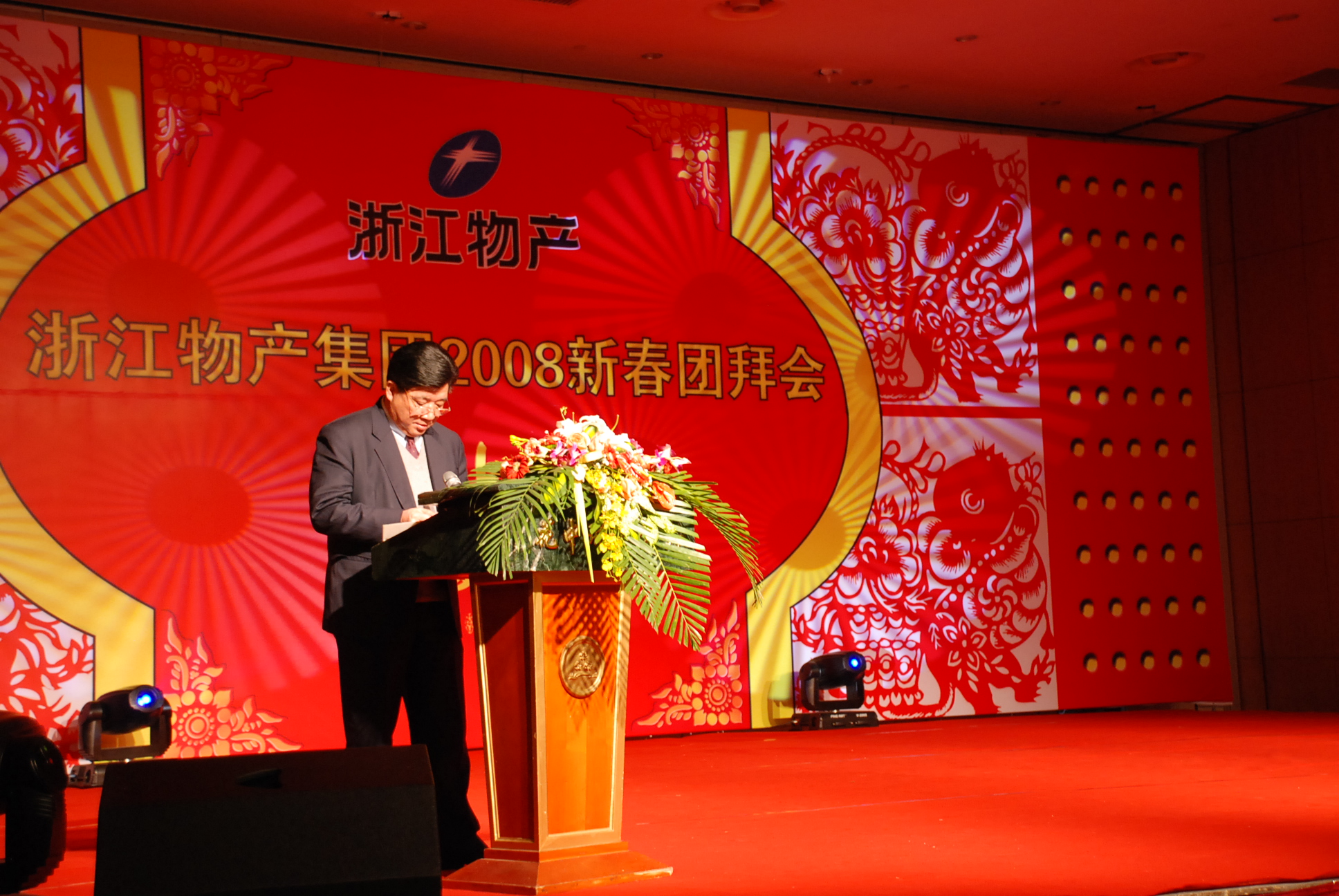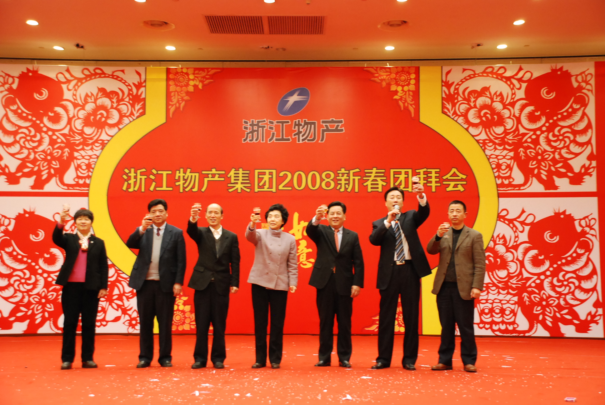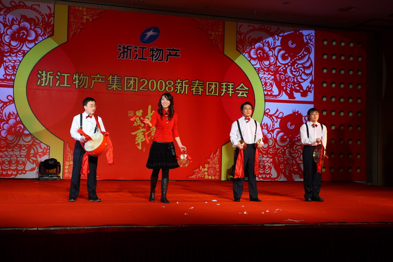 元月29日, 浙江省人民大会堂宴会厅,张灯结彩,花团锦簇,一派喜庆景象。宴会厅舞台上巨幅金鼠贺岁图鲜艳夺目,洋溢着浓浓的春意。下午3时18分,在欢快的乐曲声中,“浙江物产集团2008新春团拜会”正式开始。