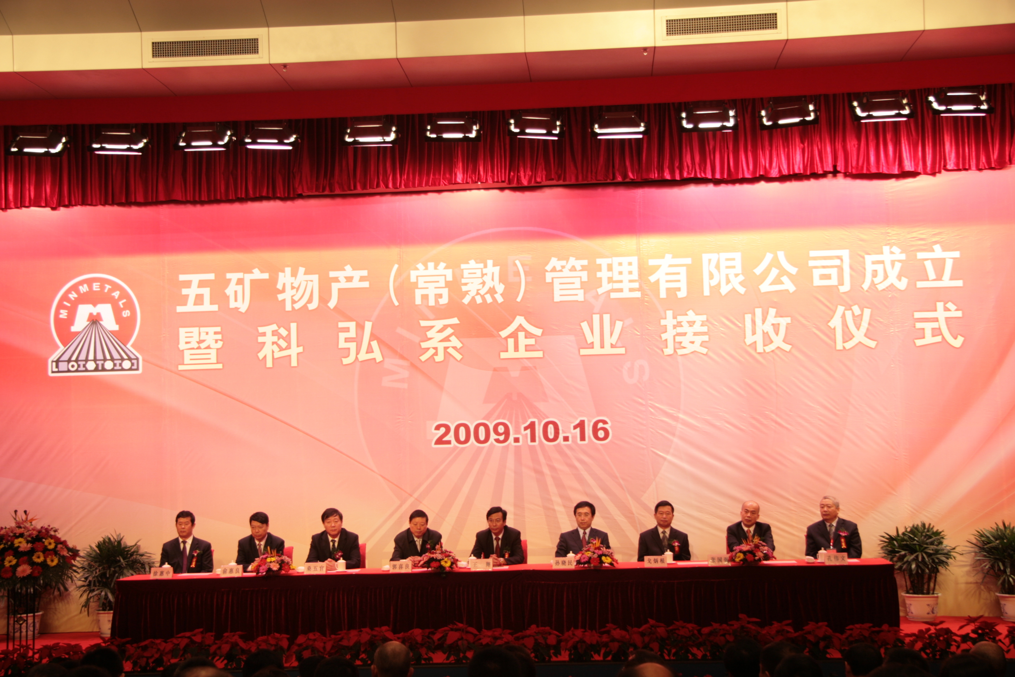 10月16日上午,五矿物产(常熟)管理有限公司成立暨科弘系企业接收仪式在常熟市滨江国际大厦隆重举行。标志着由中国五矿集团公司和浙江物产国际共同出资组建的五矿物产(常熟)管理有限公司将全面接收科弘系企业,为企业发展注入新的活力。常熟市委书记王翔、江苏省出入境检验检疫局副局长郭喜良,中国五矿集团副总裁、五矿物产常熟公司董事长孙晓民,浙江物产国际贸易有限公司董事长、五矿物产常熟公司副董事长张国强,开发区各部门主要负责人等出席仪式。