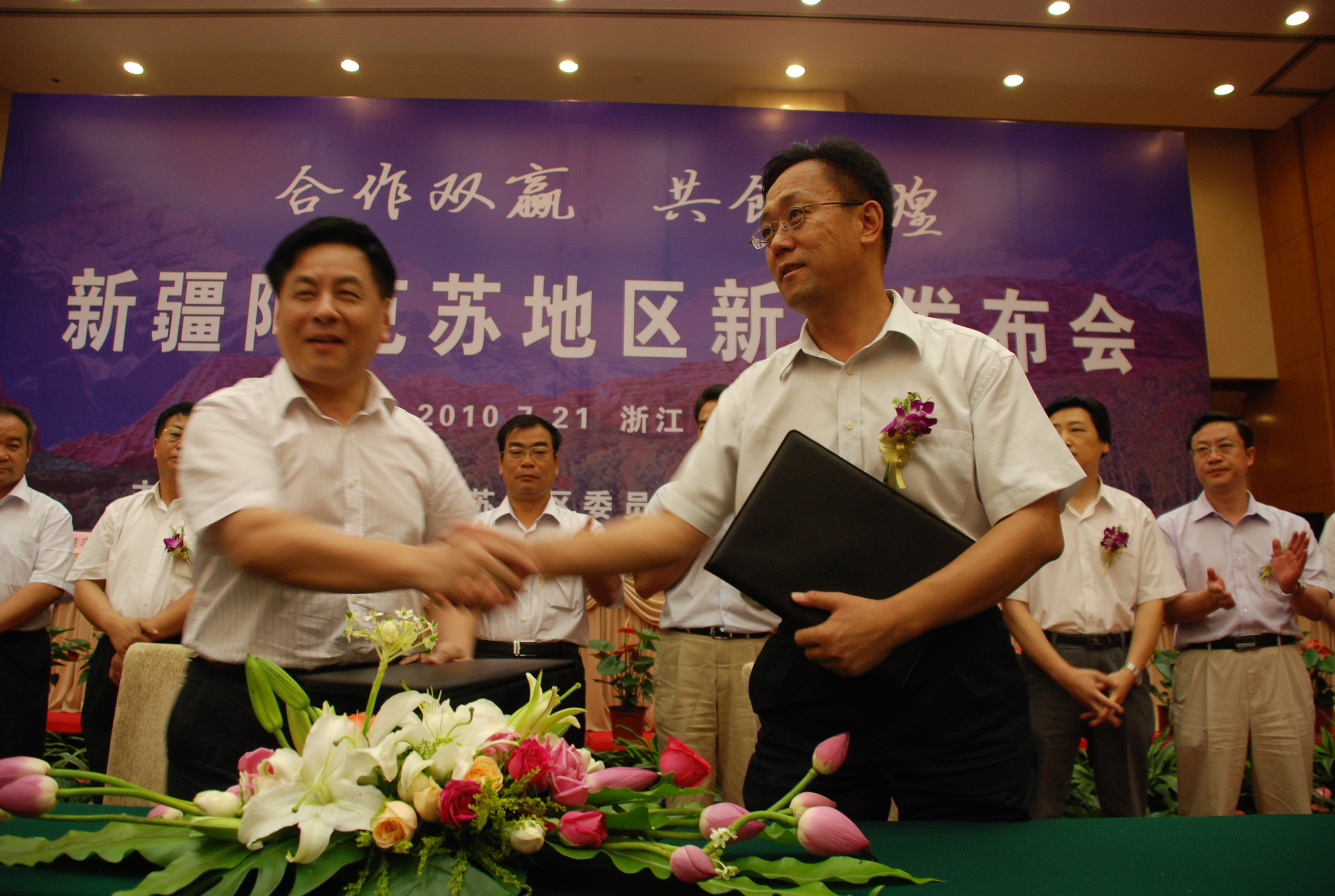 7月22日下午,在新疆阿克苏地区“合作双赢、共创辉煌”新闻发布会上,作为我省援疆建设率先启动的7个试点项目之一,胡江潮董事长代表浙江物产就援建项目与阿克苏地区正式签订了合作框架协议。