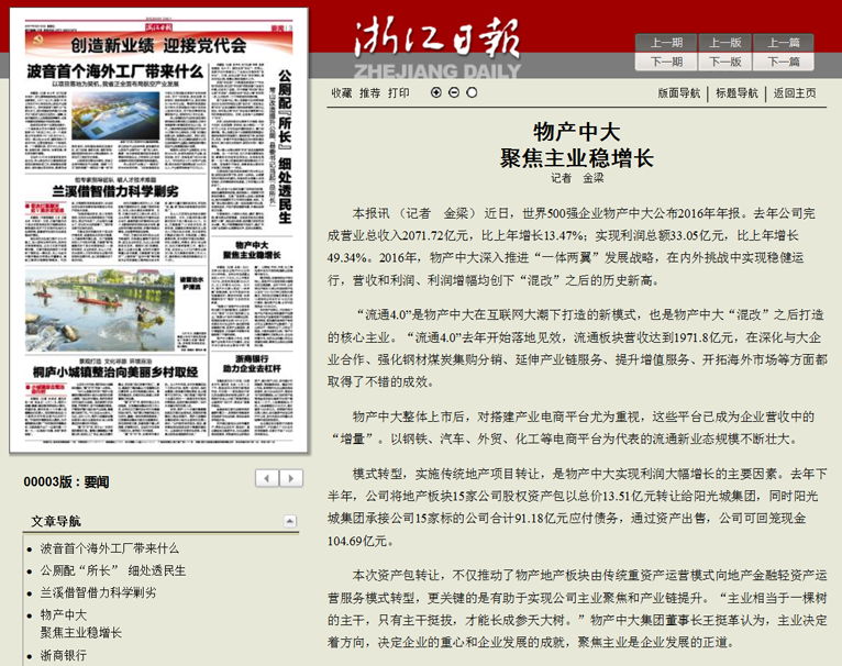 近日,世界500强企业物产中大公布2016年年报。去年公司完成营业总收入2071.72亿元,比上年增长13.47%;实现利润总额33.05亿元,比上年增长49.34%。2016年,物产中大深入推进“一体两翼”发展战略,在内外挑战中实现稳健运行,营收和利润、利润增幅均创下“混改”之后的历史新高。